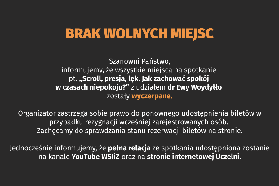 Bilety na spotkanie w ramach cyklu „W labiryncie świata”, którego gościem będzie dr Ewa Woydyłło – psycholożka, terapeutka oraz autorka publikacji poświęconych zdrowiu psychicznemu i rozwojowi osobistemu, rozeszły się w oka mgnieniu. Spotkanie pt. „Scroll, presja, lęk. Jak zachować spokój w czasach niepokoju?”, odbędzie się 29 stycznia br. o godz. 17:00 w Filharmonii Podkarpackiej. Relacja ze spotkania będzie dostępna na kanale YouTube WSIiZ oraz na stronie internetowej uczelni.