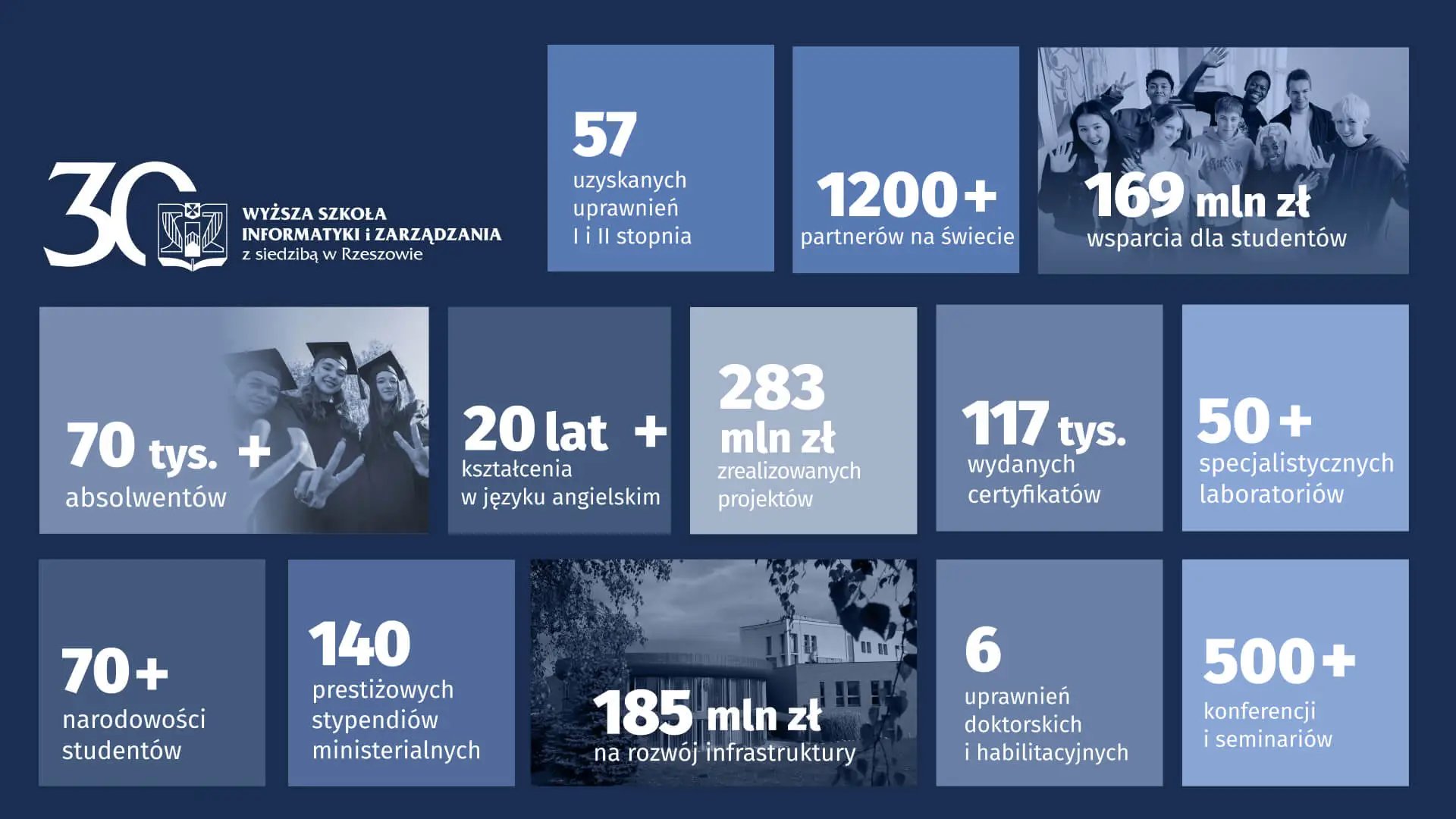 Wyższa Szkoła Informatyki i Zarządzania to infrastruktura warta ponad 400 mln złotych – 2 kampusy, ponad 50 laboratoriów. Przez te 30 lat uczelnia zrealizowała różnego rodzaju projekty za 250 mln złotych. W dużej części były to projekty edukacyjnie, naukowe i dla otoczenia.