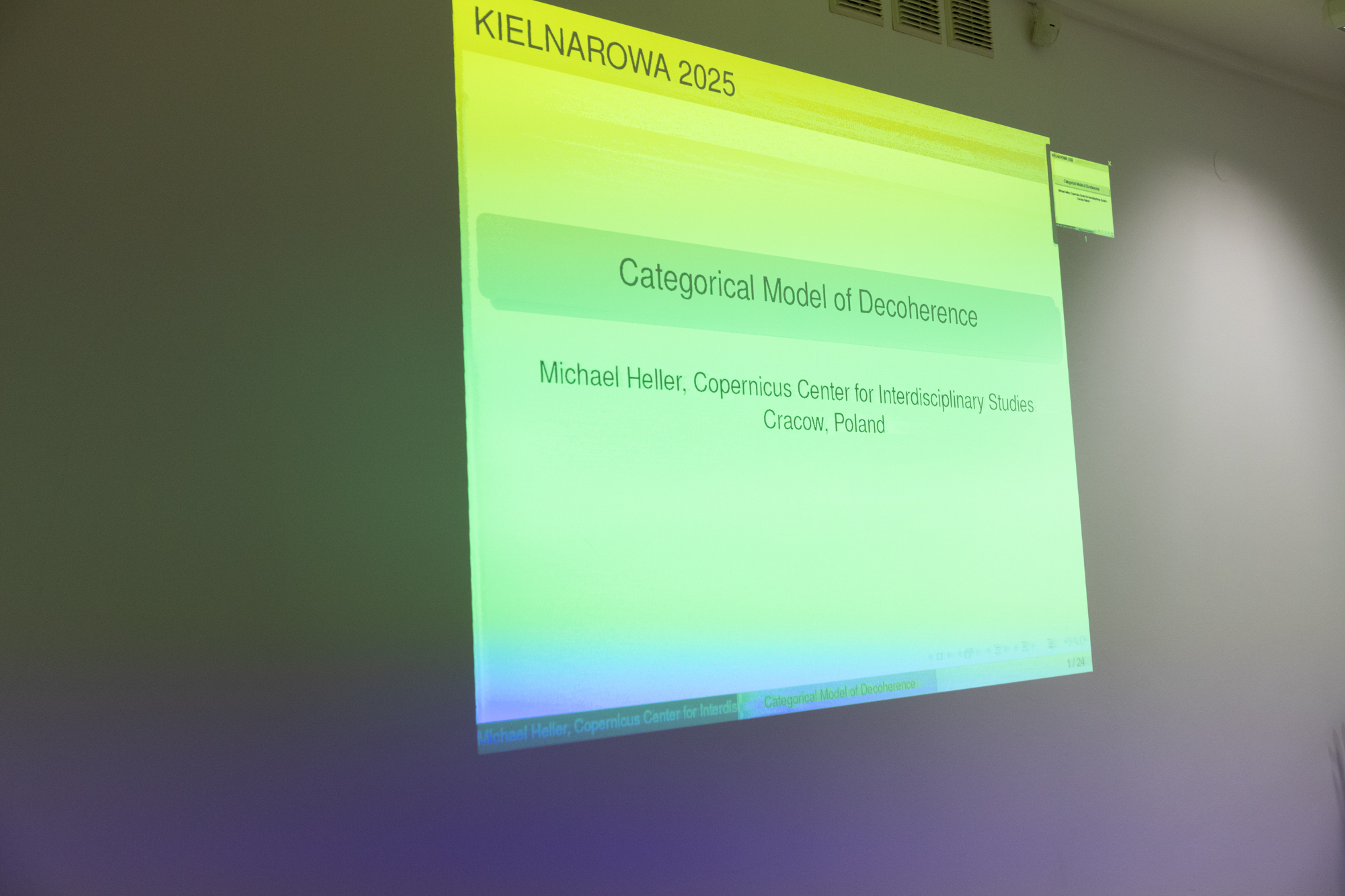 Ksiądz profesor Michał Heller mówił o możliwości wymodelowania zjawiska decoherencji kwantowej, zachodzącej przez oddziaływania ze światem klasycznym, przez dużą kategorię przestrzeni liniowych i ich morfizmów – znacznie większą niż kategoria przestrzeni Hilberta.