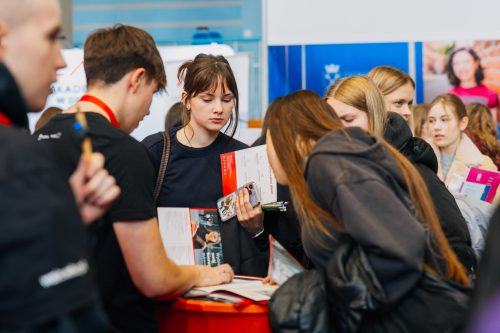 Pracownicy i studenci WSIiZ rozdawali materiały informacyjne oraz udzielali wskazówek dotyczących studiowania na naszej uczelni. Odpowiadali na wszystkie pytania dotyczące procesu rekrutacji i kształcenia, a także doradzali uczniom szkół średnich, jak wybrać najlepszy kierunek studiów dla siebie.