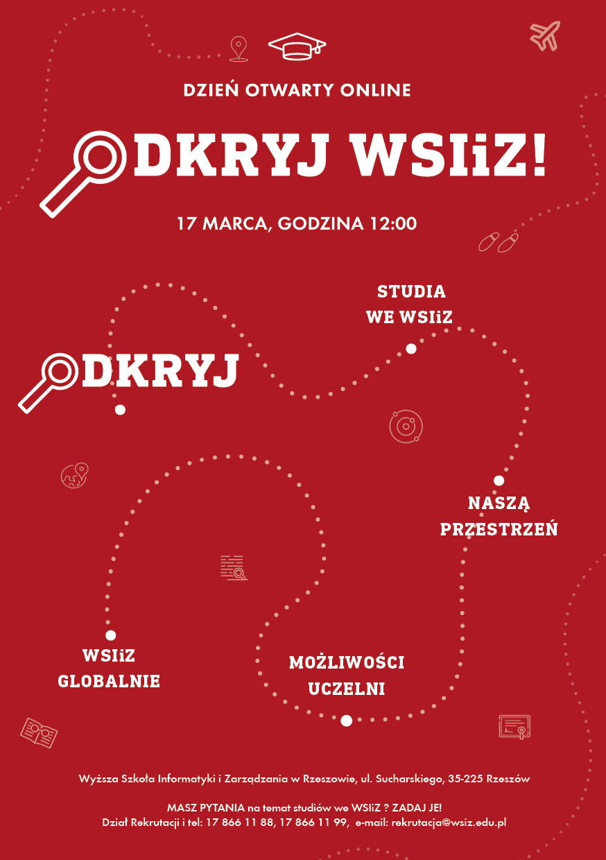 Dzień Otwarty WSIiZ to jedno z najważniejszych, cyklicznych wydarzeń Wyższej Szkoły Informatyki i Zarządzania z siedzibą w Rzeszowie, w trakcie którego prezentowana będzie oferta edukacyjna uczelni. W tym roku, ze względów bezpieczeństwa, rezygnujemy z tradycyjnej formy Dnia Otwartego (zazwyczaj odbywał się w Centrum Edukacji Międzynarodowej w Kielnarowej) i przenosimy Dzień Otwarty do Internetu!
