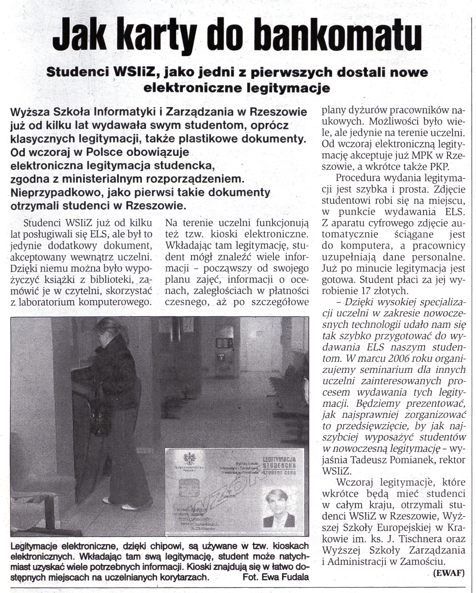 W 2006 roku rozpoczęła się cyfrowa rewolucja na uczelniach. Elektroniczna legitymacja studencka, zastępując papierową poprzedniczkę, stała się nie tylko dokumentem poświadczającym status studenta, ale również otworzyła nowe możliwości dla studentów. Patrząc na ten mały plastikowy dokument aż trudno uwierzyć, że minęło już szesnaście lat od pierwszego wprowadzenia elektronicznej legitymacji studenckiej. WSIiZ jako pierwsza Uczelnia w Polsce wprowadziła Elektroniczną Legitymację Studencką, zgodną z Rozporządzeniem Ministra Edukacji Narodowej i Sportu z 18 lipca 2005 roku. W roku 2017 Wyższa Szkoła Informatyki i Zarządzania jako pierwsza uczelnia w regionie udostępniła ELS funkcję imiennego biletu okresowego komunikacji miejskiej, a w roku 2015 funkcję płatniczą legitymacji – wspomina Piotr Bąk, Zastępca Dyrektora Pionu Informatyki WSIiZ.