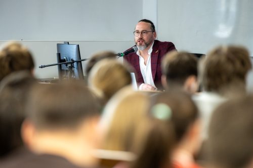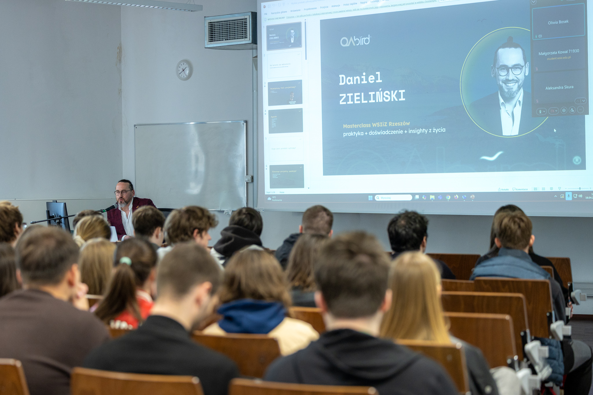 Studenci WSIiZ wzięli udział w spotkaniu z Danielem Zielińskim – CEO i założycielem QA Bird. Spotkanie dedykowane było przede wszystkim studentom kierunków graficznych – Grafika komputerowa i produkcja multimedialna oraz Projektowanie graficzne, ale uczestniczyli w nim również studenci kierunków marketingowych.