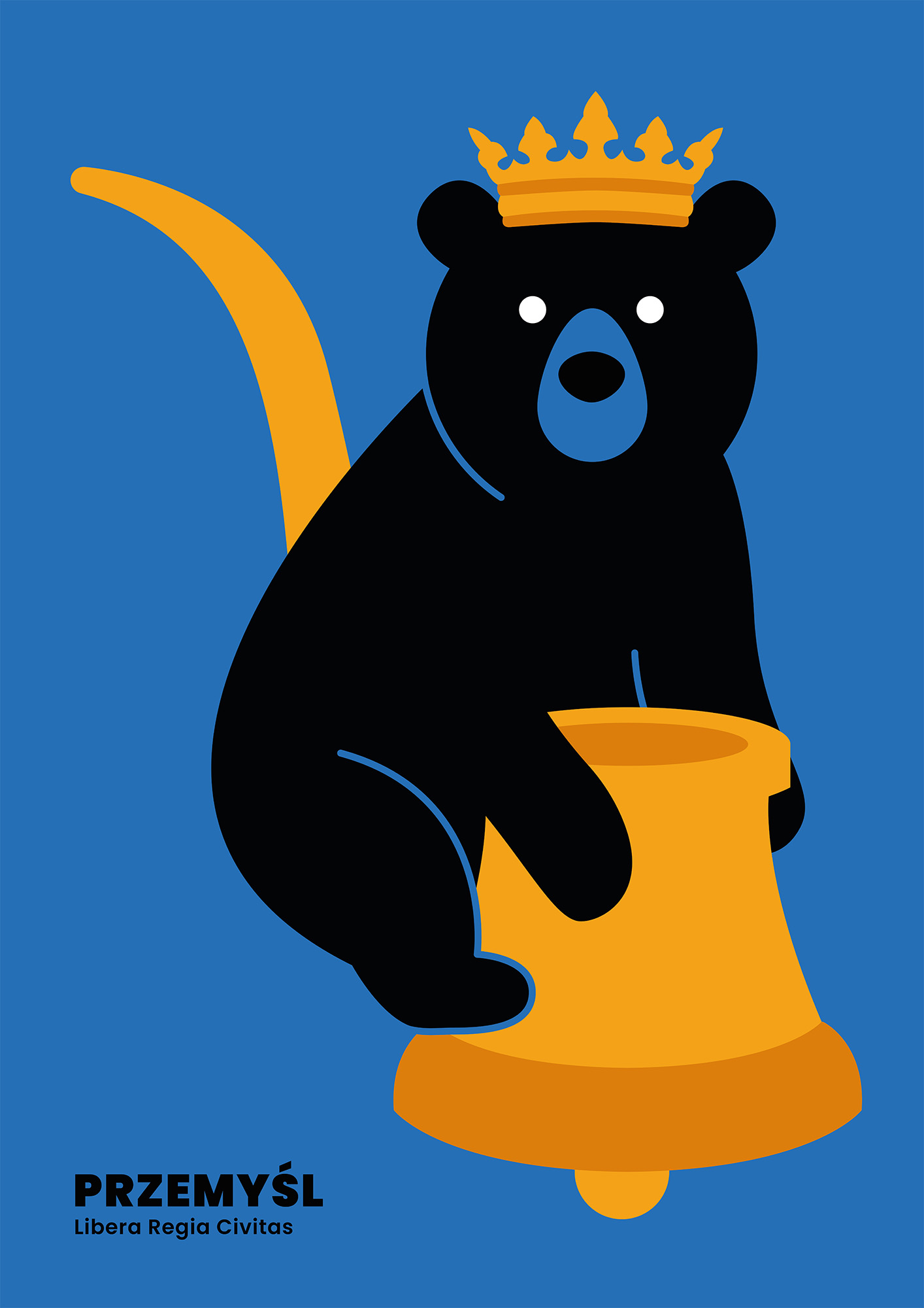 Plakat „City’s Symbol” promuje miasto Przemyśl poprzez wykorzystanie kolorów oraz symboli z herbu. Plakat przedstawia niedźwiedzia w koronie, siedzącego na fajce zakończonej dzwonem – nawiązuje to do historii, tradycji i przemysłu miasta – tak swoją pracę opisuje Kacper Łogonowicz.
