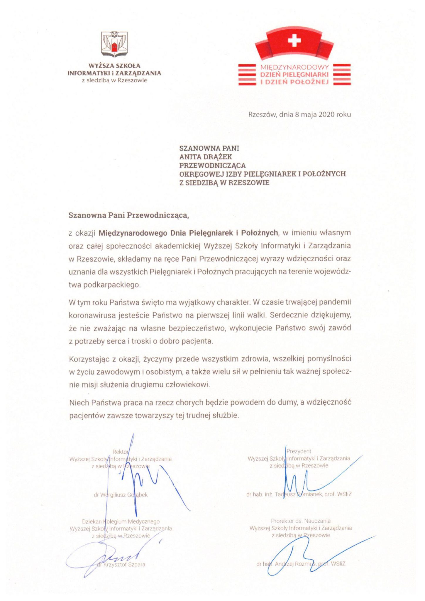 W uznaniu ciężkiej i odpowiedzialnej pracy pielęgniarek i położnych, z okazji przypadających w dniach 8 maja – Dnia Położnej oraz 12 maja – Międzynarodowego Dnia Pielęgniarki, społeczność akademicka Wyższej Szkoły Informatyki i Zarządzania z siedzibą w Rzeszowie składa podziękowania, wyrazy uznania i najlepsze życzenia dla wszystkich pielęgniarek i położnych w województwie podkarpackim.