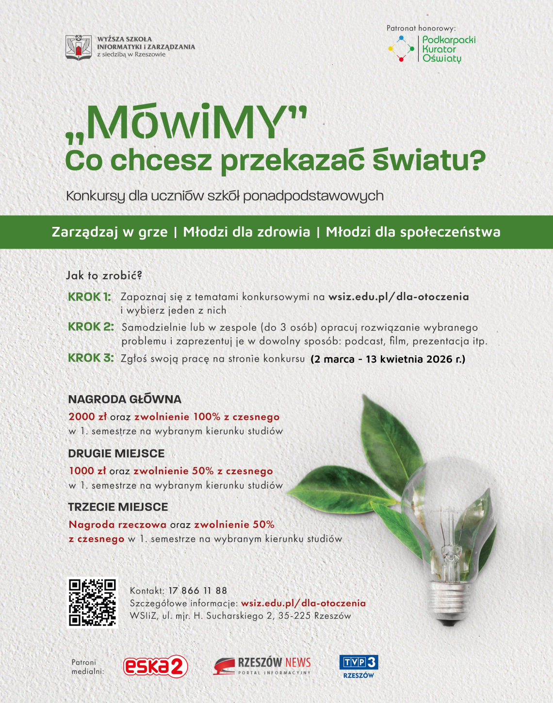 Wyższa Szkoła Informatyki i Zarządzania w Rzeszowie po raz kolejny organizuje konkursy „MówiMY” Co chcesz przekazać światu? Celem konkursów jest aktywne zaangażowanie uczniów szkół ponadpodstawowych w wypowiedzenie się na ważne tematy dla naszej planety. W tym roku na uczestników czeka nowość.