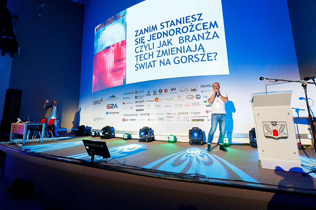 Jako pierwszy na wielkiej scenie wystąpił Artur Kurasiński, przedsiębiorca, twórca gier i komiksów, który opowiadał o obecnych „władcach Internetu”. – Zajęli miejsce dawnych wizjonerów i w tej chwili „przepuszczają świat przez konta bankowe” – komentował gorzko, przestrzegając przed zagrożeniami systemu, w którym zarabianie pieniędzy wyprzedza i dominuje ideę zmiany świata na lepszy.