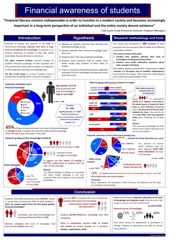 Koło Naukowe FLOW wraz z Instytutem Badań i Analiz Finansowych zajęło się tematyką świadomości finansowej studentów i przeprowadziło badania wśród 380 osób. Plakat autorstwa naszych studentów został uznany za najlepszy i zdobył pierwsze miejsce w swojej kategorii wiekowej – komentuje mgr Karolina Palimąka.