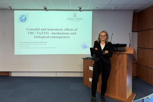Istotnym elementem pobytu było zaproszenie pracowników Katedry Biotechnologii i Biologii Komórki do wygłoszenia dwóch wykładów związanych z prowadzoną przez nich działalnością naukową we WSIiZ. Dr hab. Anna Tabęcka-Łonczyńska, prof. WSIiZ, zaprezentowała podsumowanie swoich badań naukowych z ostatnich kilku miesięcy na temat negatywnego oddziaływania ksenobiotyku TBC na komórki rozrodcze i neuronalne – tytuł prezentacji: „Gonadal and neurotoxic effects of TBC-TAZTO – mechanisms and biological consequences”.