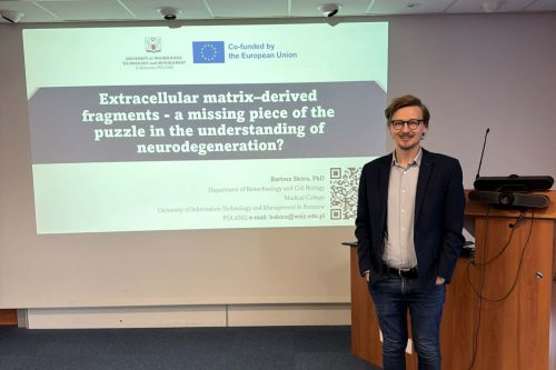 Z kolei dr Bartosz Skóra przybliżył zebranym wyniki swojej dwuletnej pracy nad wpływem fragmentów powstałych z białek macierzy zewnątrzkomórkowej na komórki pochodzenia mózgowego i ich zdolności do indukcji neurodegeneracji in vitro – tytuł prezentacji – „Extracellular matrix–derived fragments – a missing piece of the puzzle in the understanding of neurodegeneration?” Wykłady wzbudziły duże zainteresowanie i żywą dyskusję.