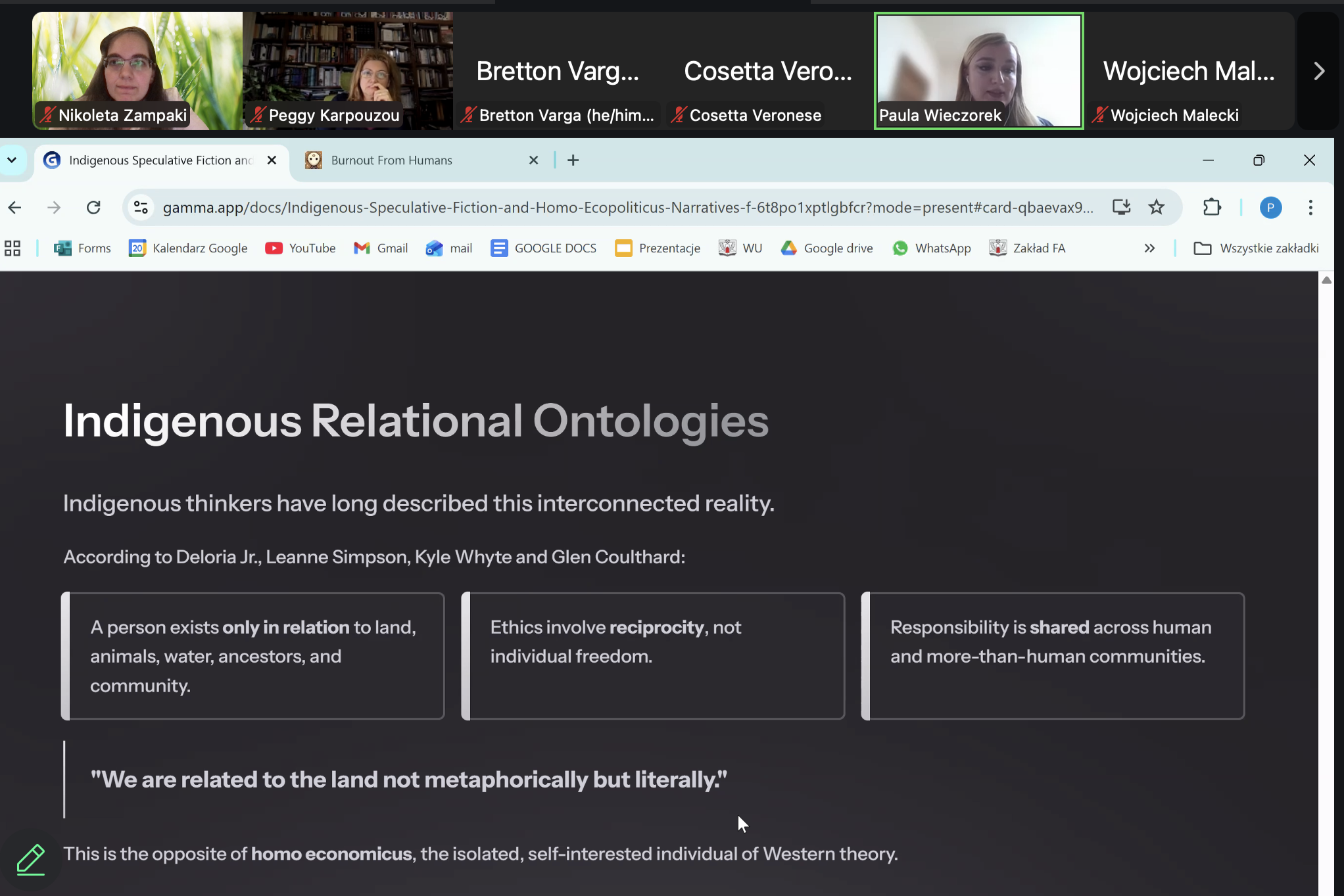 Dr Paula Wieczorek, Prodziekan Kolegium Mediów i Komunikacji Społecznej, zaprezentowała referat “Indigenous Speculative Fiction and Homo Ecopoliticus: Narratives for Ecological Justice in the Anthropocene”. Jej wystąpienie podkreśliło, że kultura i literatura rdzennych narodów Ameryki Północnej stanowią istotne źródło wiedzy ekologicznej, w którym wyraźnie artykułowane są modele odpowiedzialności środowiskowej, relacji między ludźmi i nie-ludzkimi bytami oraz koncepcje sprawiedliwości środowiskowej – mające fundamentalne znaczenie w dobie antropocenu.
