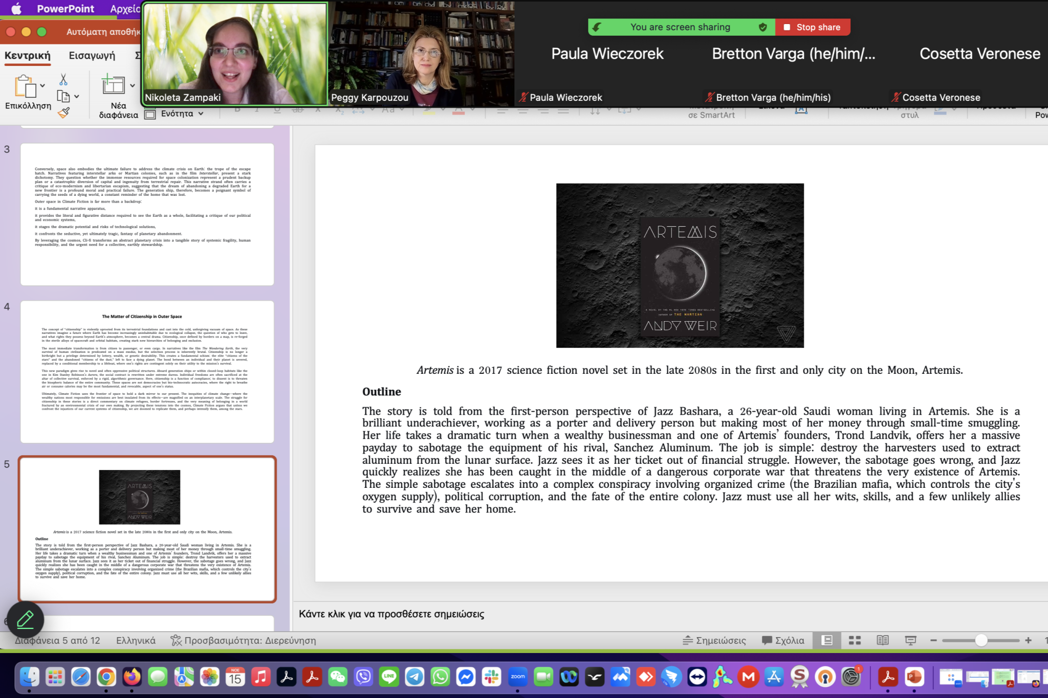 Dr Nikoleta Zampaki, wykładowczyni WSIiZ i Hellenic Naval Academy w Grecji, a także PostDoc na National and Kapodistrian University of Athens, zaprezentowała referat “Outer Space and Citizenship in Andy Weir’s Artemis and Michael Makropoulos’ Mars”. Jej wystąpienie analizowało ekologiczno-polityczne modele obywatelstwa w narracjach science fiction, które przedstawiają życie w pozaziemskich koloniach na Księżycu i Marsie.
