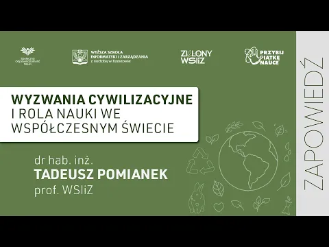 Podczas wykładu dr hab. inż. Tadeusz Pomianek, prof. WSIiZ, odpowie na wiele trudnych pytań dotyczących naszej przyszłości. Wykład pt. „Wyzwania cywilizacyjne i rola nauki we współczesnym świecie” odbędzie się 12 czerwca br. na kanale YouTube WSIiZ. Będzie ostatnim w tej edycji wykładem w ramach cyklu „Przybij piątkę nauce”.