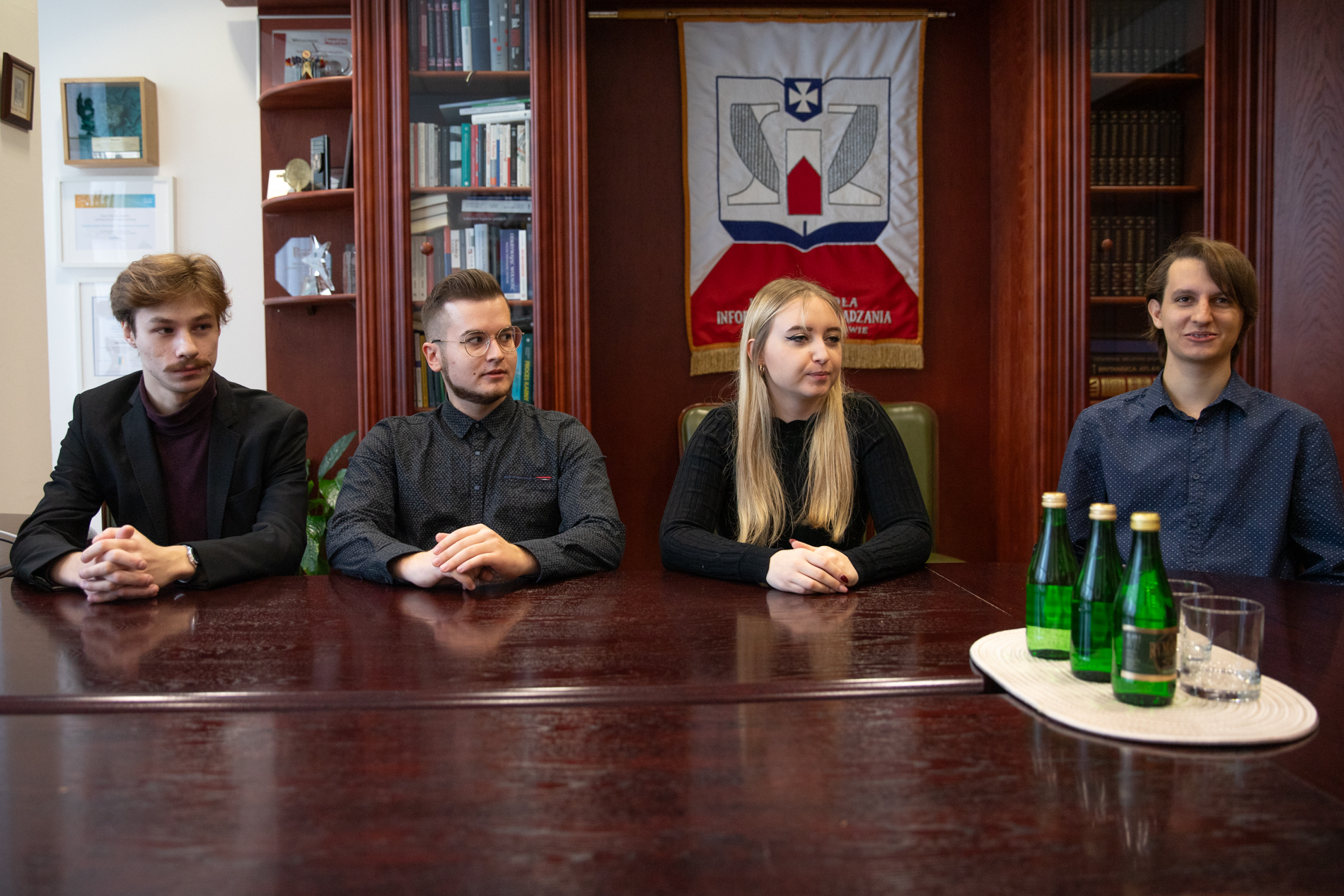 Członkowie grupy HexaTeam – Angelika Prędka, Mateusz Seredyński, Marek Wawrzak oraz Igor Jajuga uczestniczyli w spotkaniu z Rektorem dr hab. Andrzejem Rozmusem, prof. WSIiZ, oraz Prorektorem ds. Nauczania dr Barbarą Przywarą. Studenci opowiadali o dotychczasowych sukcesach oraz planach na kolejne zawody.