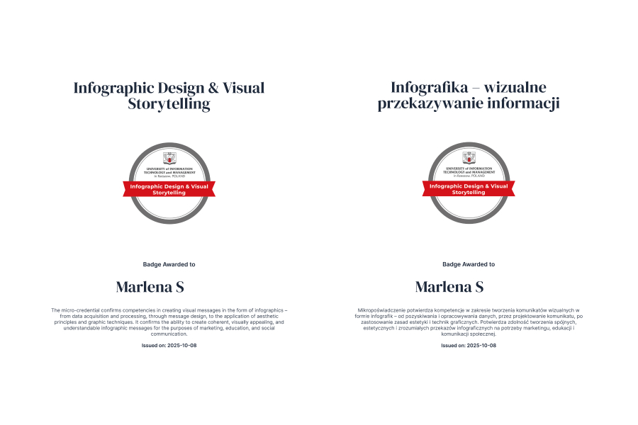 Jeśli udało Ci się zrealizować wszystkie dodatkowe zadania i wykładowca to potwierdzi, wówczas otrzymujesz na swojego e-maila mikropoświadczenie w formie pliku PDF i odznaki cyfrowej przypisanej do tej konkretnej kompetencji. Każdy dokument jest podpisany cyfrowo i zawiera unikalny identyfikator (także QR), który pozwala na weryfikację autentyczności. Co więcej wydawany jest on w dwóch wersjach językowych: polskiej i angielskiej.
