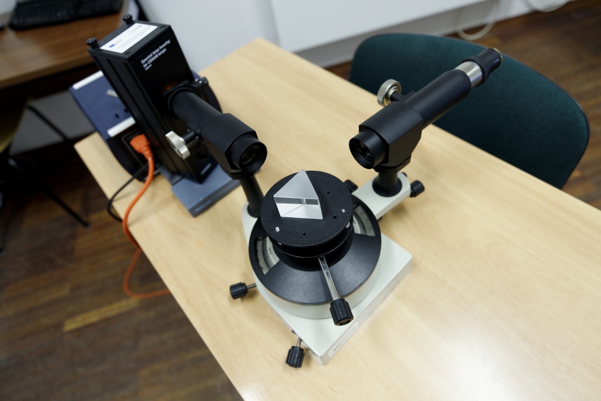- spektrometr optyczny wyposażony w lunetę z okularem typu Ramsden, kolimatorem z regulowaną szczeliną oraz podziałkę kątową z noniuszem,