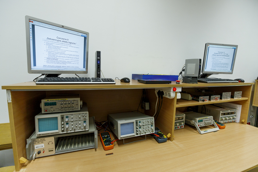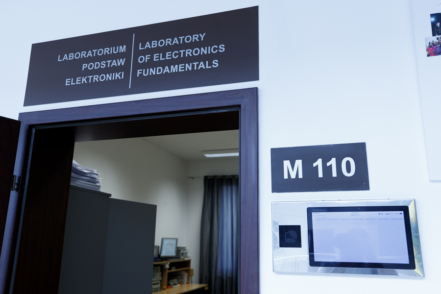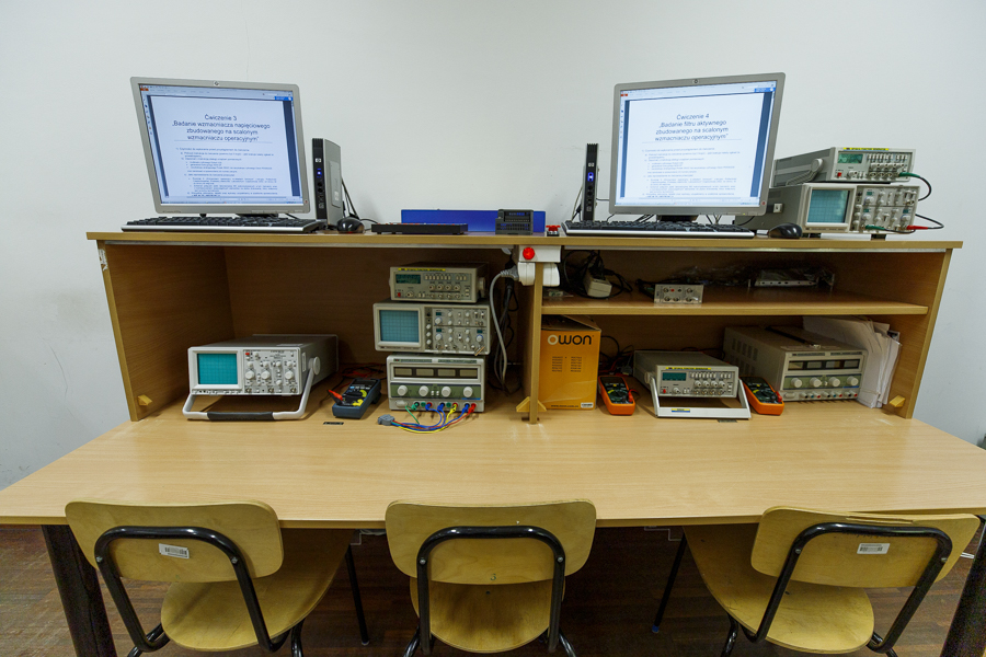Laboratorium zlokalizowane jest w sali KM110 i ma na celu zapoznanie studenta z typowymi układami elektronicznymi oraz adekwatnymi przyrządami i sposobem ich wykorzystania w pomiarach realizowanych samodzielnie przez studenta. W laboratorium prowadzone są zajęcia praktyczne do przedmiotu Podstawy elektrotechniki i elektroniki.